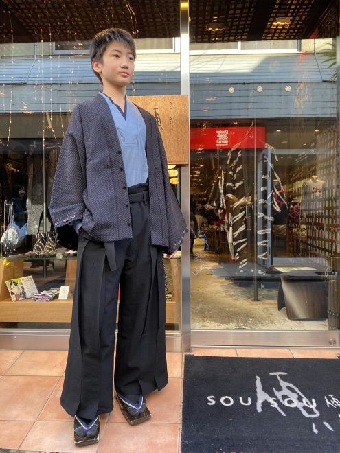 襟元が風靡に変わるだけでもグッと雰囲気が変わりますが、袴形のように上衣をインして履くパンツを合わせていただければさらにカッコよくなりますよ!!