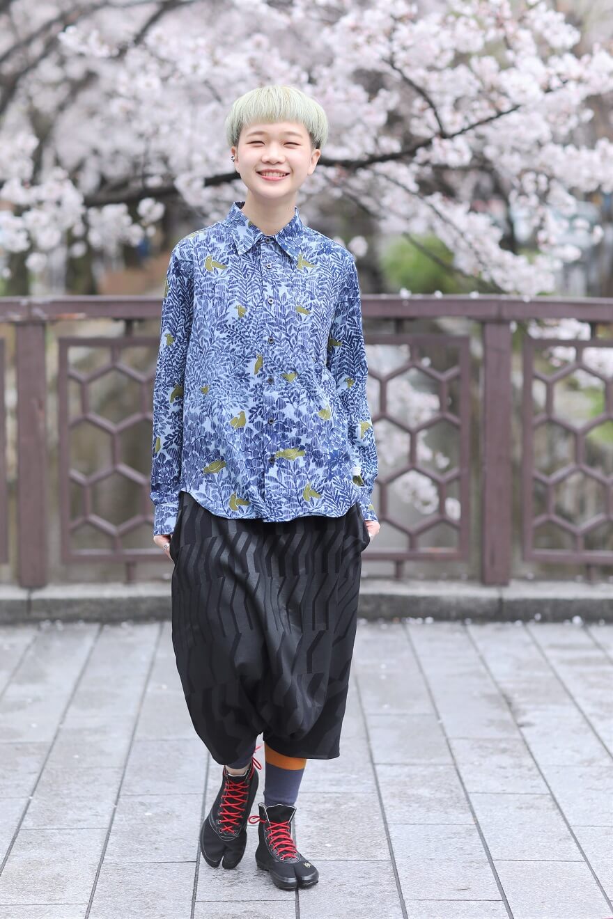 高島縮のシャツに大文字山という、SOU・SOU le coq sportif春夏定番のコーディネート。こんな姿で、花舞う街を颯爽と歩いてみたい。(しょうしょう)