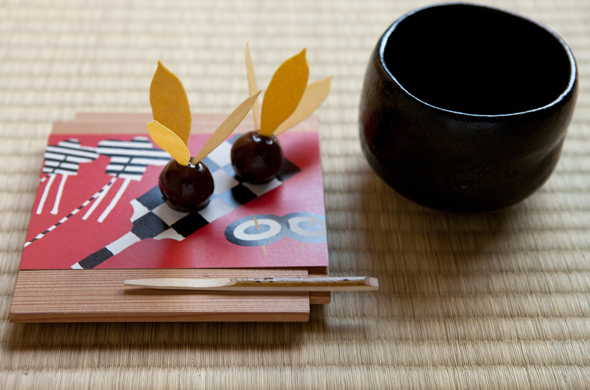 亀屋良長の銘菓「烏羽玉」に、ニッキ味のお干菓子の羽根を付けて、
