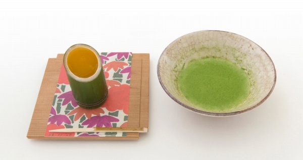テキスタイルに合わせたオレンジ色は、マンゴーの水羊羹。竹筒を斜めにカットするなど、京都の夏の冷菓「竹筒羊羹」をSOU・SOU流にアレンジしました。