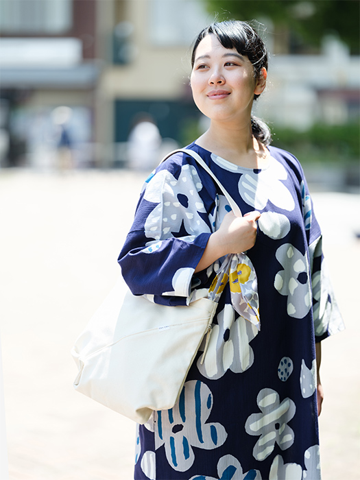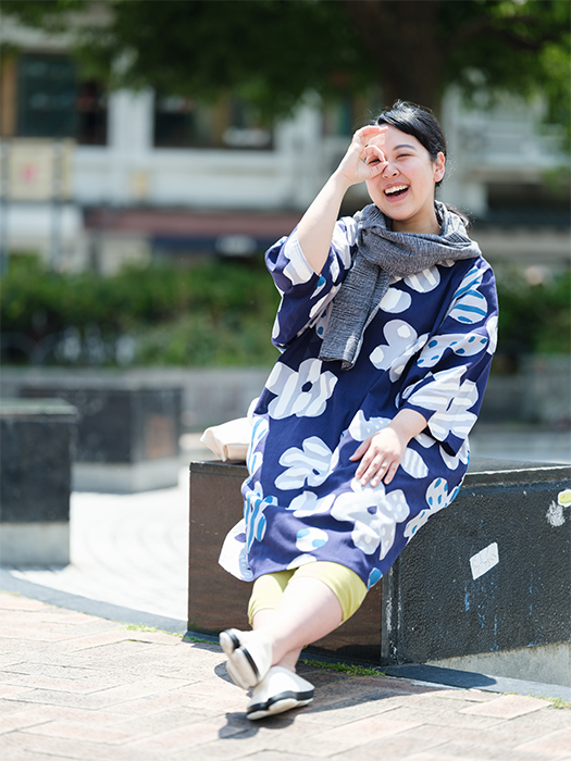 テキスタイルを思う存分楽しめるワンピース「薙刀長方形衣」が華やかで可愛いコーディネイト。体感温度-2度ともいわれる高島縮は夏にはかかせない抜群の着心地です。首元には「くびまき」を巻いて、冷房・夏の日差し避けに◎(企画主任 山本聖美)