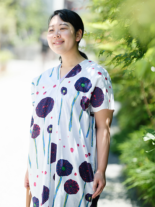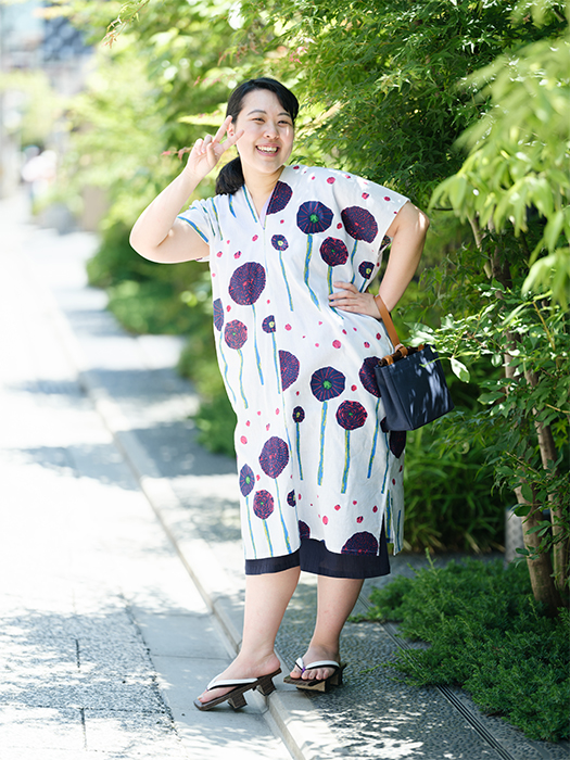 手ぬぐい生地を使用した柔らかい着心地のワンピースをメインに。SOU・SOUらしい貫頭衣のデザインは肩のラインに沿って二の腕をほどよくカバーしてくれるのも嬉しいポイント。軽やかに夏風を楽しめる一着です。(企画主任 山本聖美)