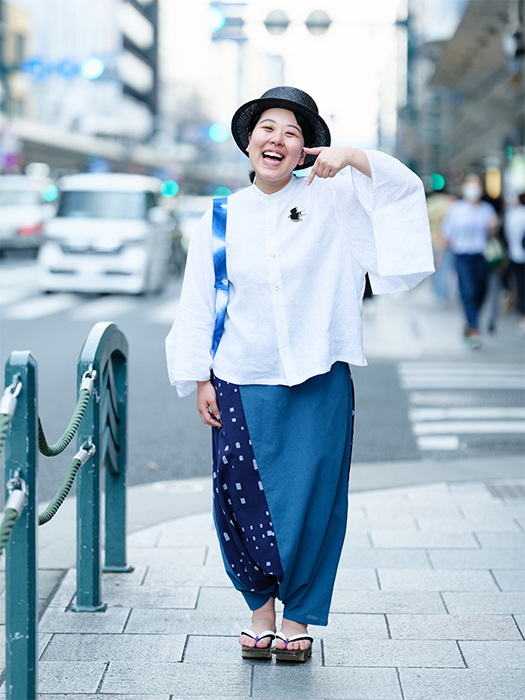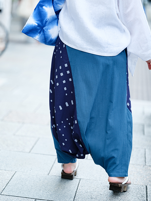 小袖がポイントのシャツ「草衣」を、富士山をイメージした形のズボン「富士」に合わせました。目を引くカジュアル和装スタイルの完成です!(企画主任 山本聖美)