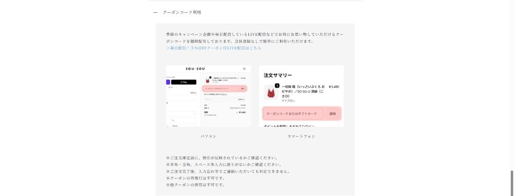 また、LIVE配信では\SOU・SOUの全商品が5%OFF/でお買い物できる日替わりクーポン番号をお伝えしております。