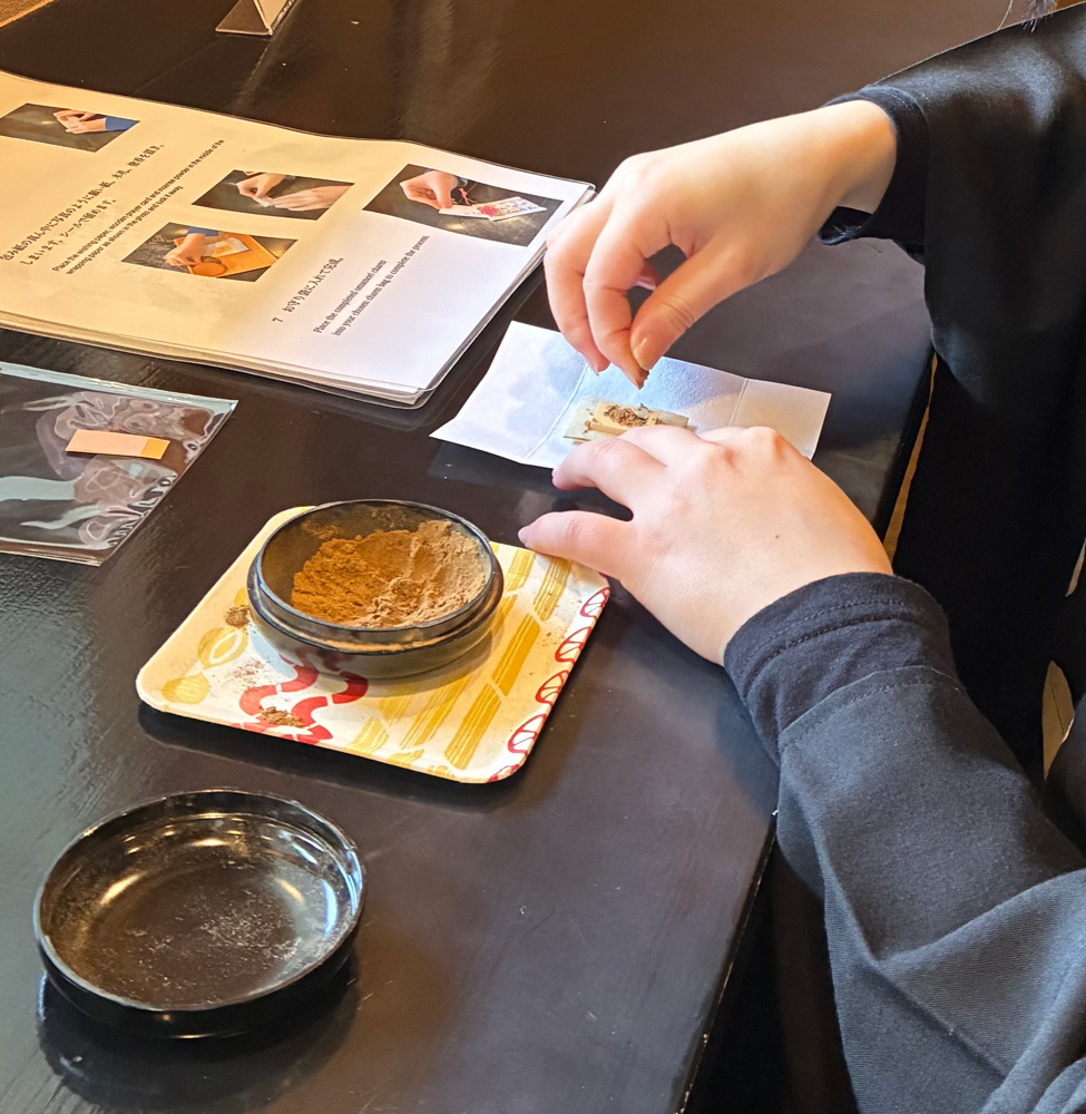 ④包み紙の上に「願いごと」を書いた和紙と「御守護」と書かれた木札を載せ、お香を上からかけます。