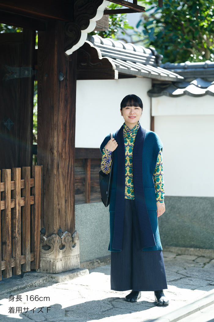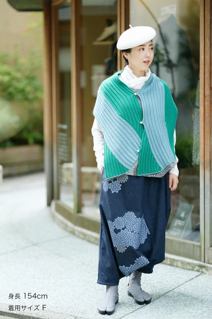 小巾の反物に見立てた二枚の編地で構成した羽織です。