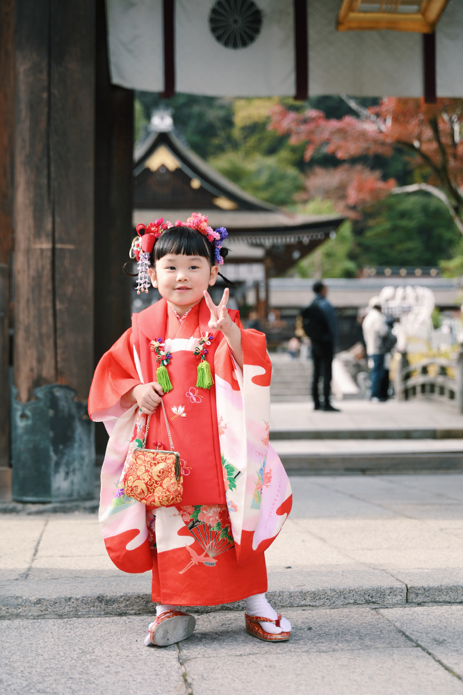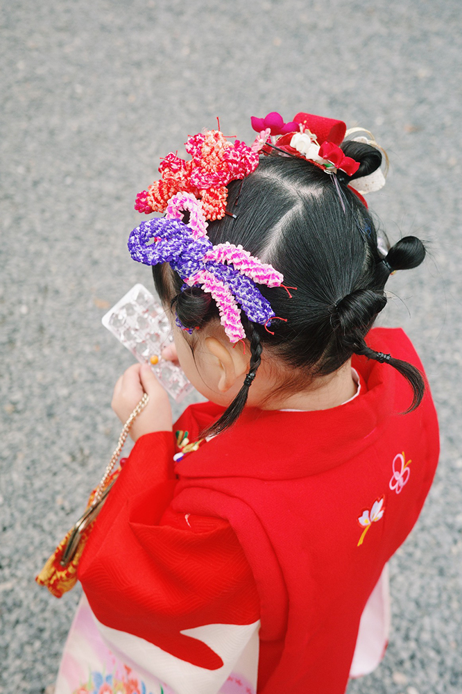 着物以外の被布、草履、かばん、髪飾りはすべて私が子供の頃に七五三で着用したものです。