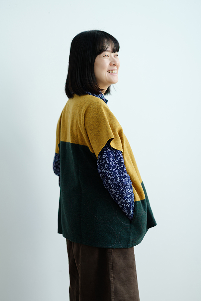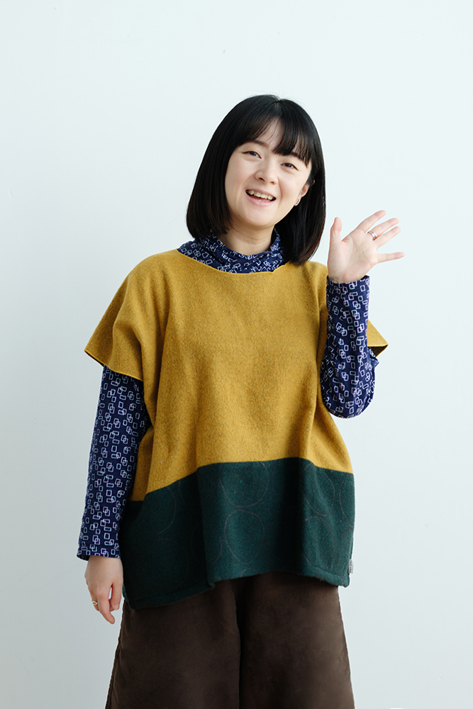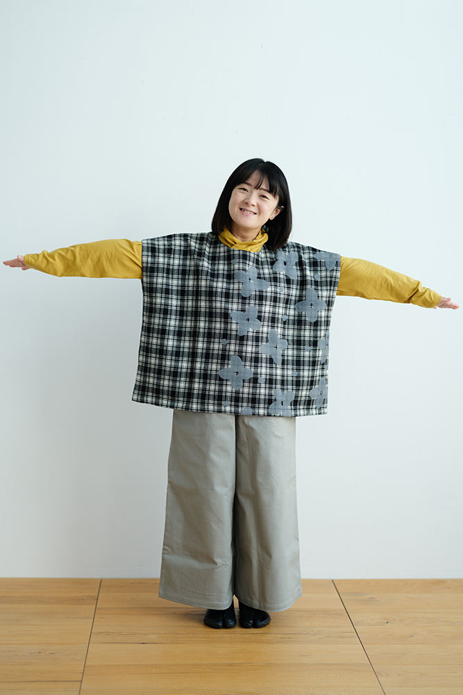 ラ:そうなんです!四角の形に穴が3つ開いたら服になるんだ!すごい!って。しかもかわいいし!て思いました。着たら肩のラインもすっと落ちて馴染むし、こんなに賢い服は初めて見た!って思いました。