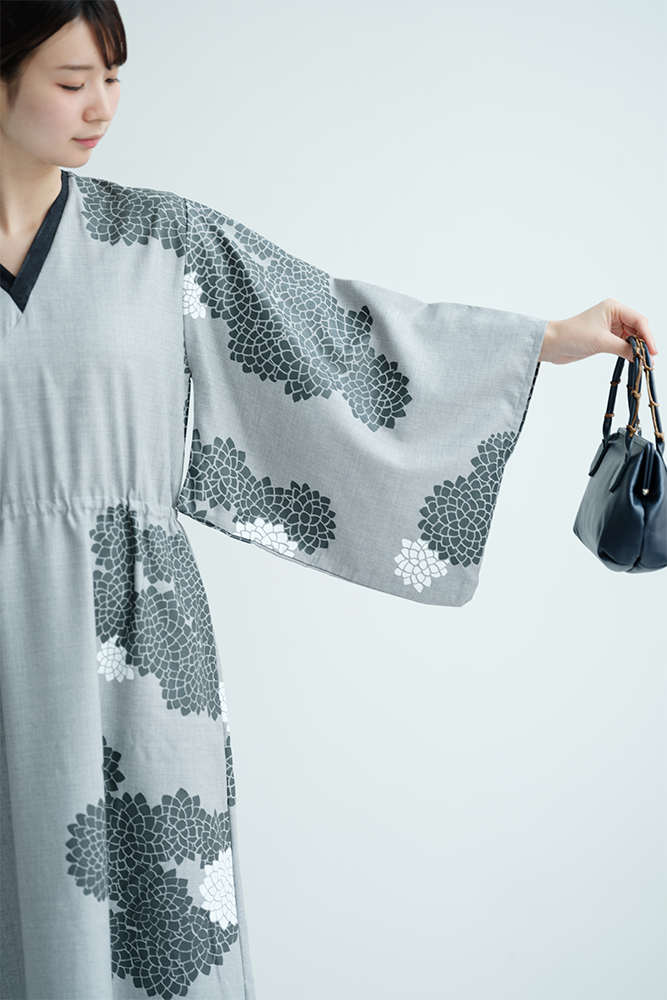 ・梳毛 半衿みたて衣裳/雲間に菊と余白 杢灰 女Mサイズ