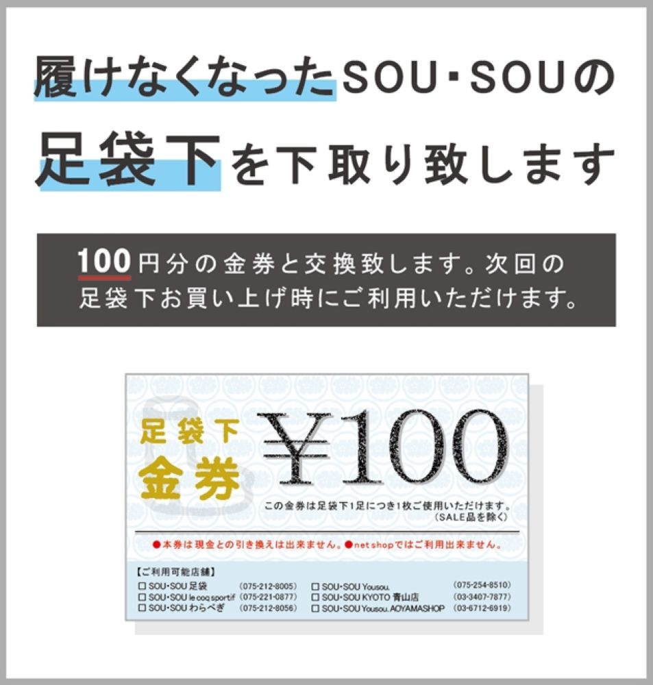 店舗限定ですが、お持ちいただくと『足袋下下取り100円券』と交換いたします。