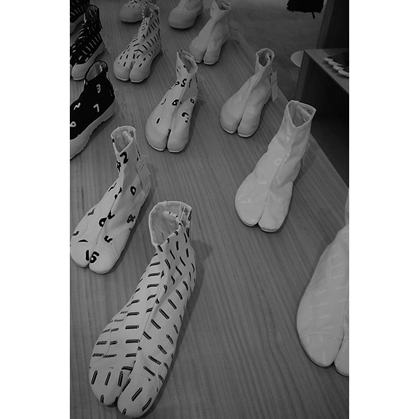 地下足袋の柄はSO-SU-UとHA-KOの2柄各白黒。デザインは、先の割れたものと先が丸いものの2型作った。