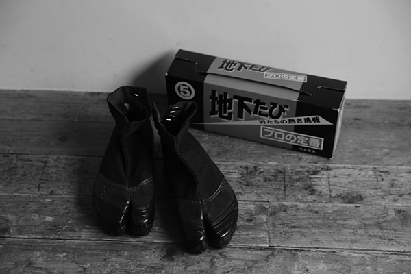 ある日何かのときにサンプルとして買っておいたいわゆる黒い地下足袋を倉庫で見つけてまじまじと眺めていた。