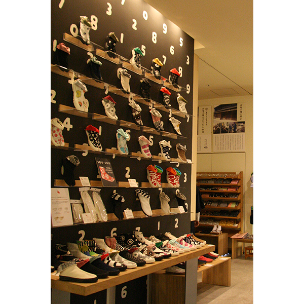 カラフルでポップな地下足袋が壁一面に並ぶと店内の雰囲気は一変した。
