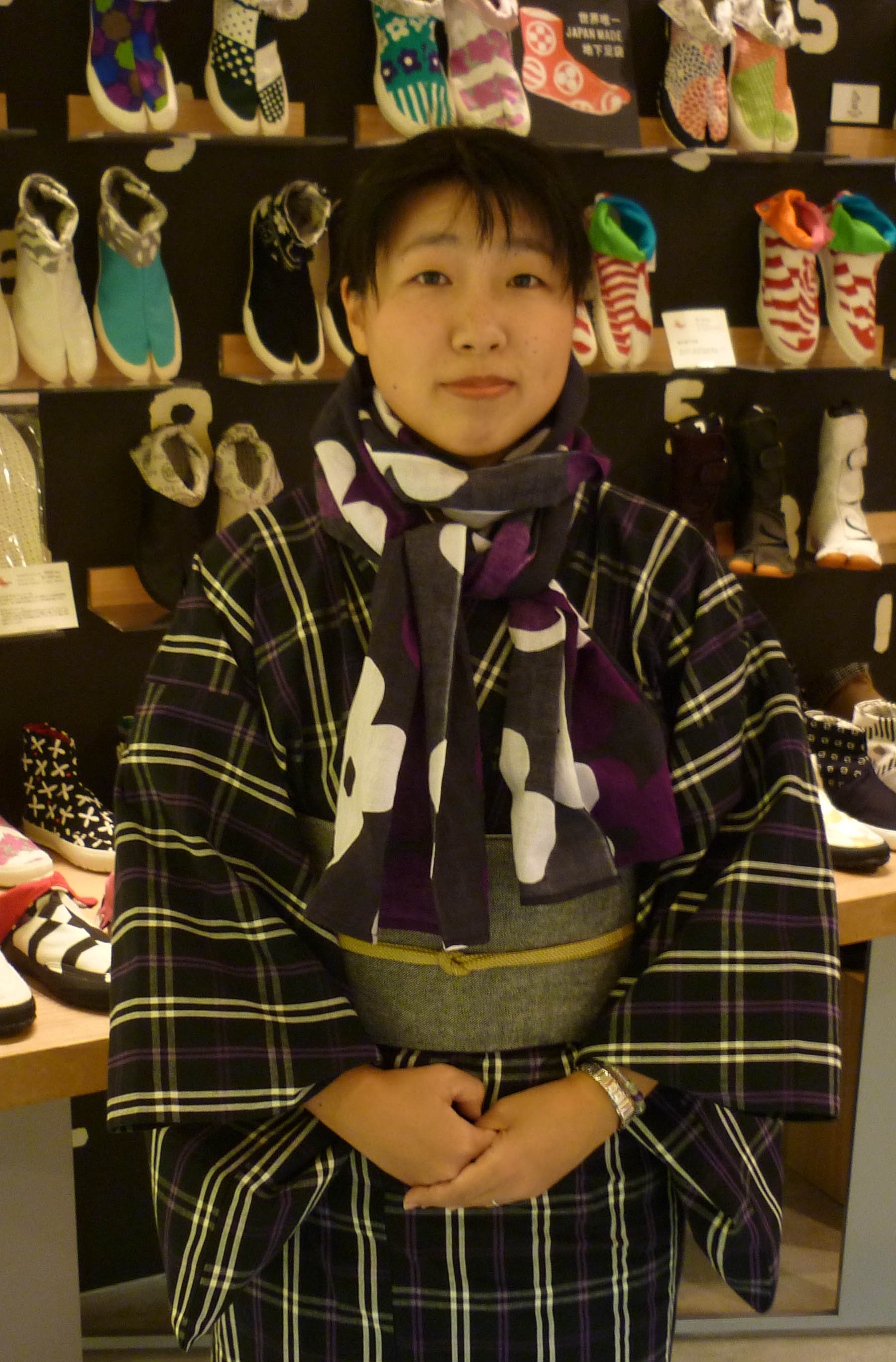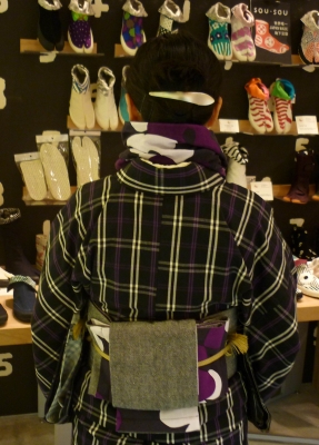 おとな むらさき今週のお客様は、伊勢木綿のきものをすっきり着こなされている 関様です。ご旅行で京都に行かれた際にSOU・SOUに出会われたそうで、それ以来、きものの他にも みかも下駄 や ストレッチ足袋なども愛用していただいています。 今日のコーディネートは、紫でまとめておられます。おとなっぽくて、素敵です!くびまき と 半幅帯 の柄の合わせ方も、ナイスコンビネーションです。関様、この度はご協力ありがとうございます。またのご来店、お待ちしております!高橋木ノ実