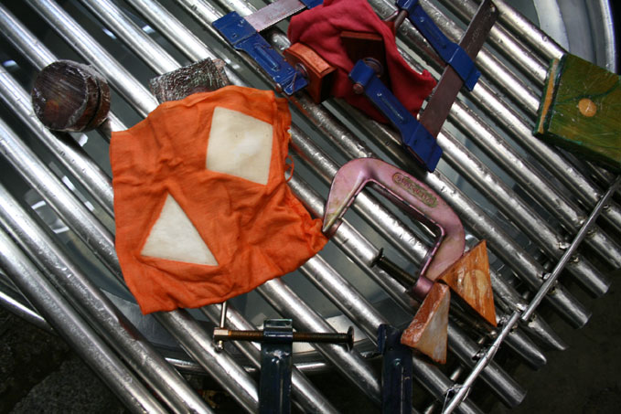 この、洋服にはない長所に目をつけて、布をすべてひも状に裂いて織ることで布の余りを出さない服を作りました。