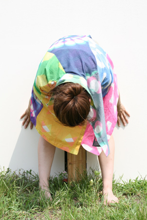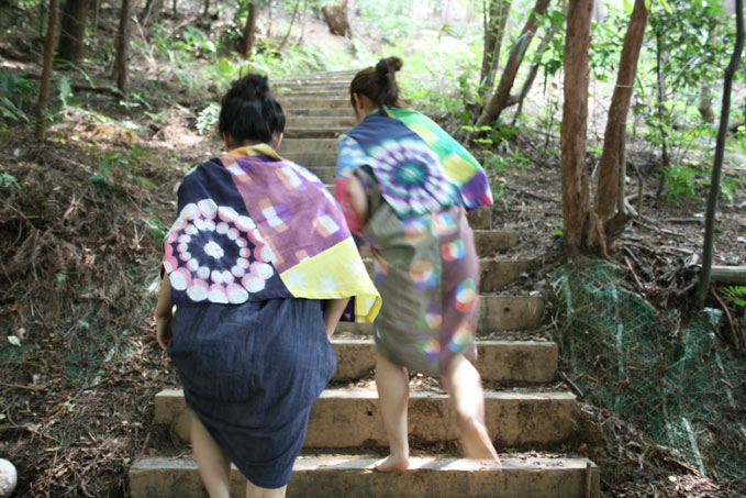 イメージは川で遊ぶ女の子で、涼しさを感じる色をランダムに組み合わせしました。夏の代表的な物は蚊取り線香とすだれを取り上げて、しぼり染めとタックで表現しました。