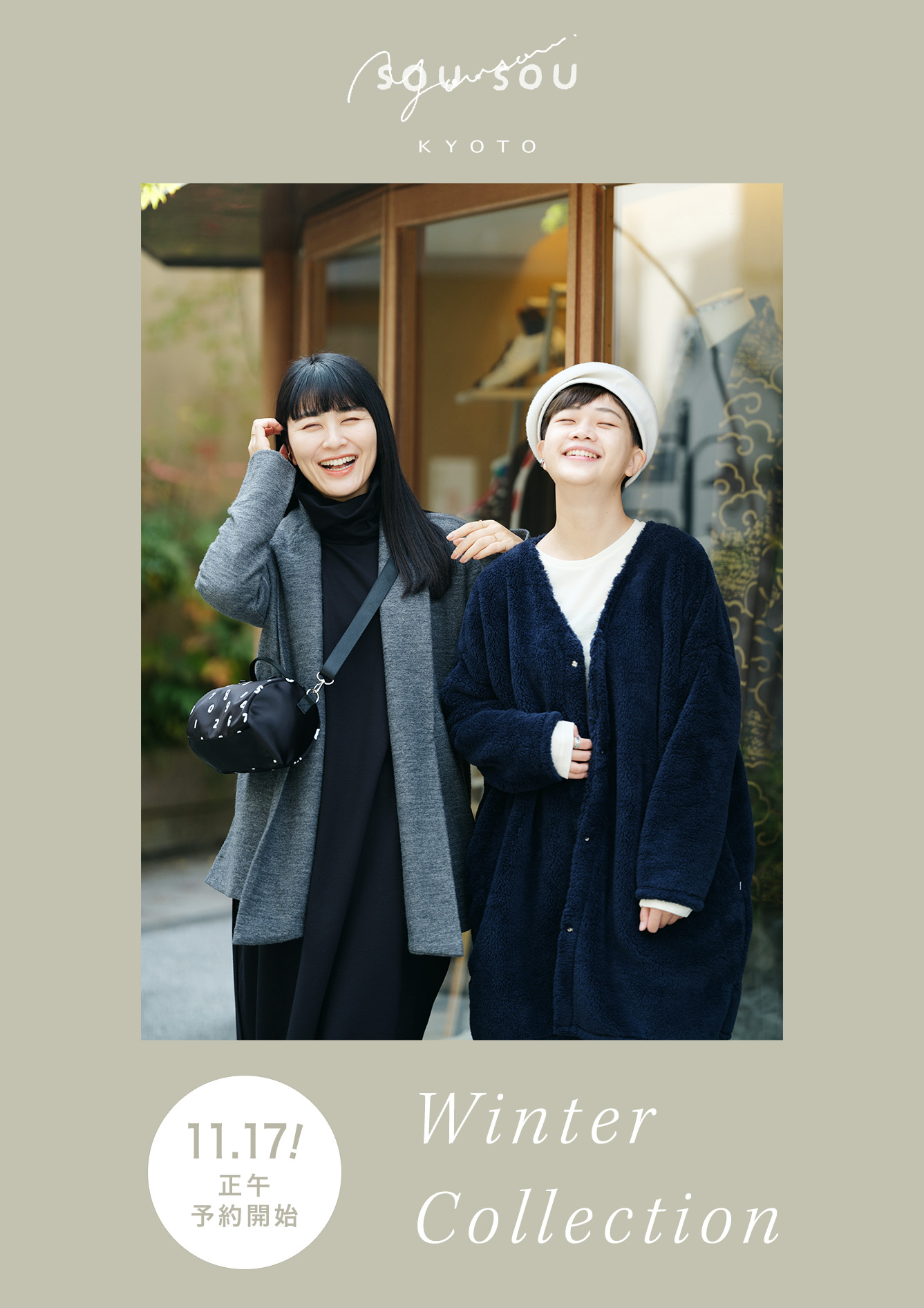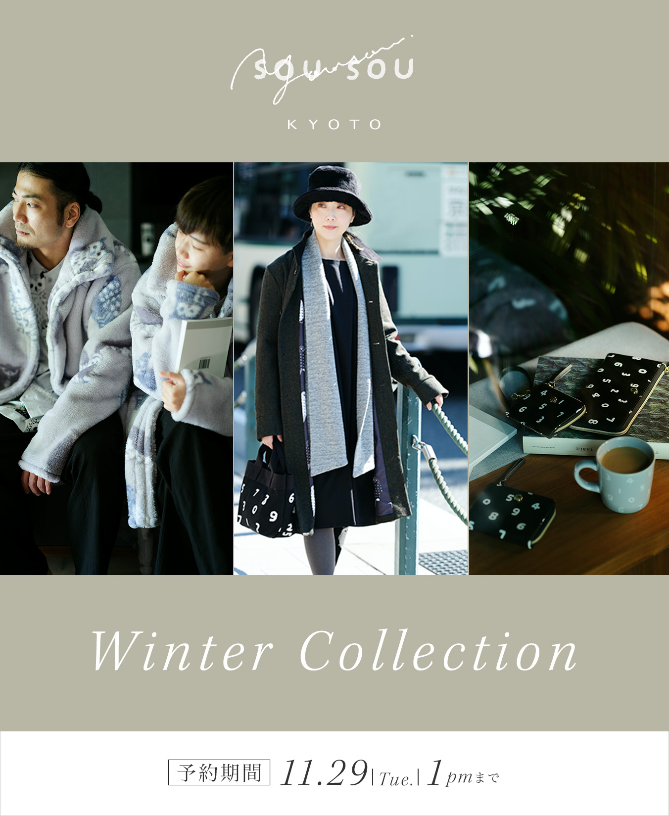 SOU・SOU Yousou. Winter Collection 予約が開始!この冬、コートやブルゾン、ローブなどを中心に、チュニックやワンピース、シルエット様々なボトムス類などを揃えました。バッグや財布などの小物類も充実のラインナップ。ご予約特典には『 企画限定ブレスレット 』をご用意しております。