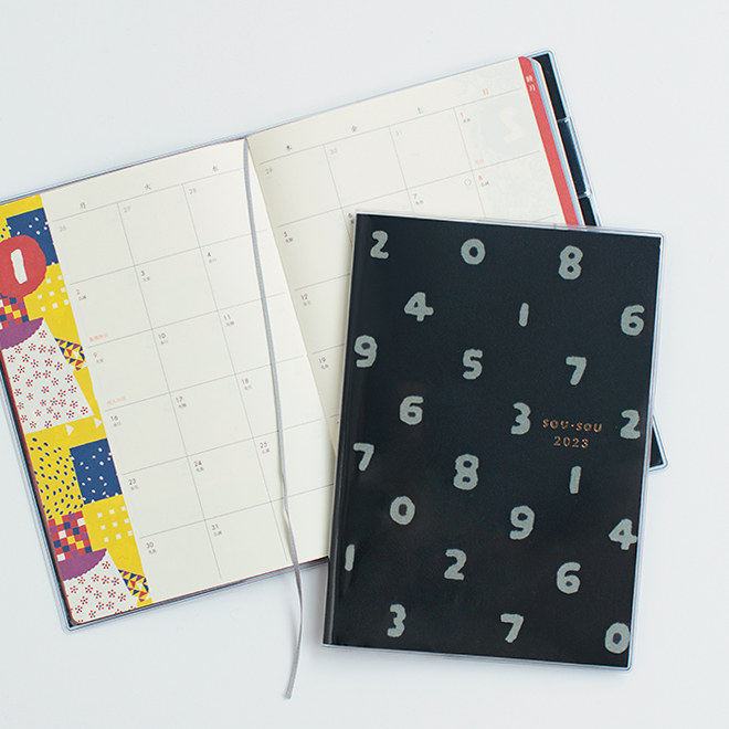 飽きのこないシンプルな表紙、その月をイメージした人気のテキスタイルデザイン、自由に書き込めるフリーページ。毎日の生活にちょっとした彩りを添える、SOU・SOUオリジナルのスケジュール帳です。