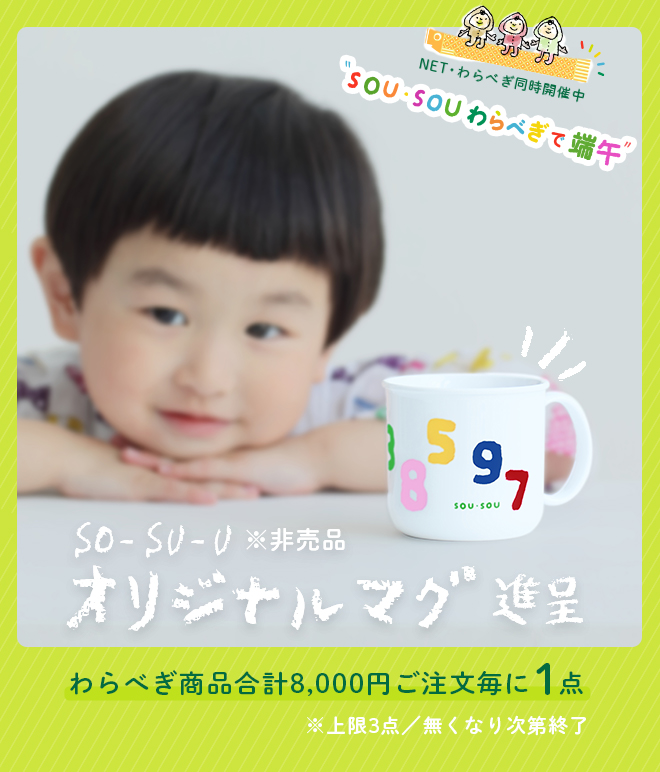 【特 典】クーポン等適用前のわらべぎ商品合計8,000円ご注文毎に『SO-SU-U柄 オリジナルマグカップ』を1点プレゼント!※上限3点