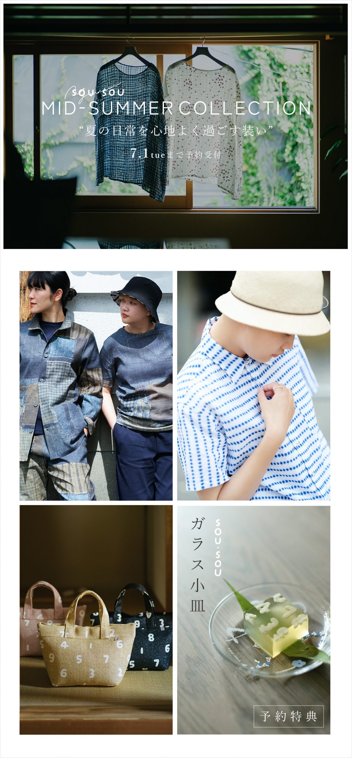 『 SOU・SOU Yousou. 盛夏コレクション 』を 6/19(木)正午に販売開始しました。ご予約特典には、『 オリジナルガラス小皿※非売品 』をご用意しております。