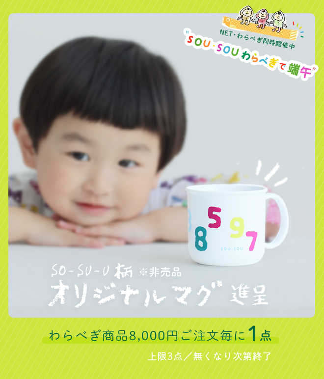 SOU・SOUでもささやかなお祝いの気持ちを込めて、期間中、わらべぎ商品8,000円ご注文毎オリジナルマグカップを1点プレゼント!※上限3点