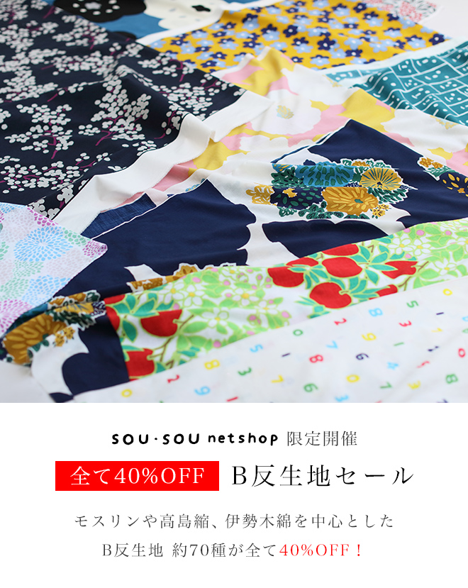 モスリンや高島縮、伊勢木綿を中心とした70種以上の生地が全て40%OFF!種類豊富なSOU・SOUのテキスタイルをお安くお求めいただけるチャンス。ぜひ、この機会にご検討くださいませ。