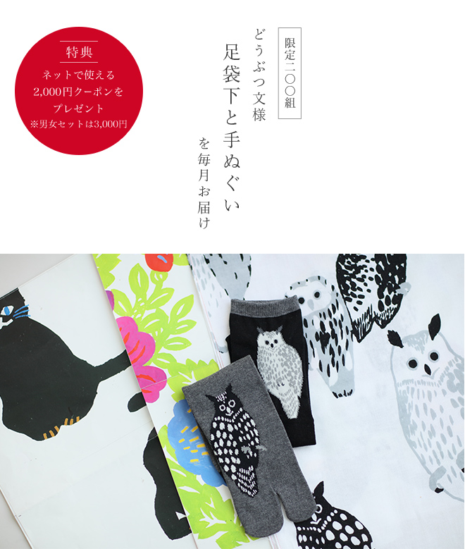 「足袋下」と「伊勢木綿 手ぬぐい」をセットにして一年間毎月お届けする年間購買の受付を開始。十二ヶ月のデザインをお楽しみくださいませ。