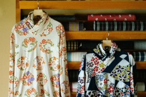 「季節ごとの柄が楽しい!」という方、「昨年買ってみた無地は着心地よかったから、今年は柄物を!」とお考えのあなた、新柄<木版>(上・右写真)などのやや明るい柄はいかがですか。シンプルなボトムズと合わせれば、はつらつとした元気な雰囲気がうまれるはずです。