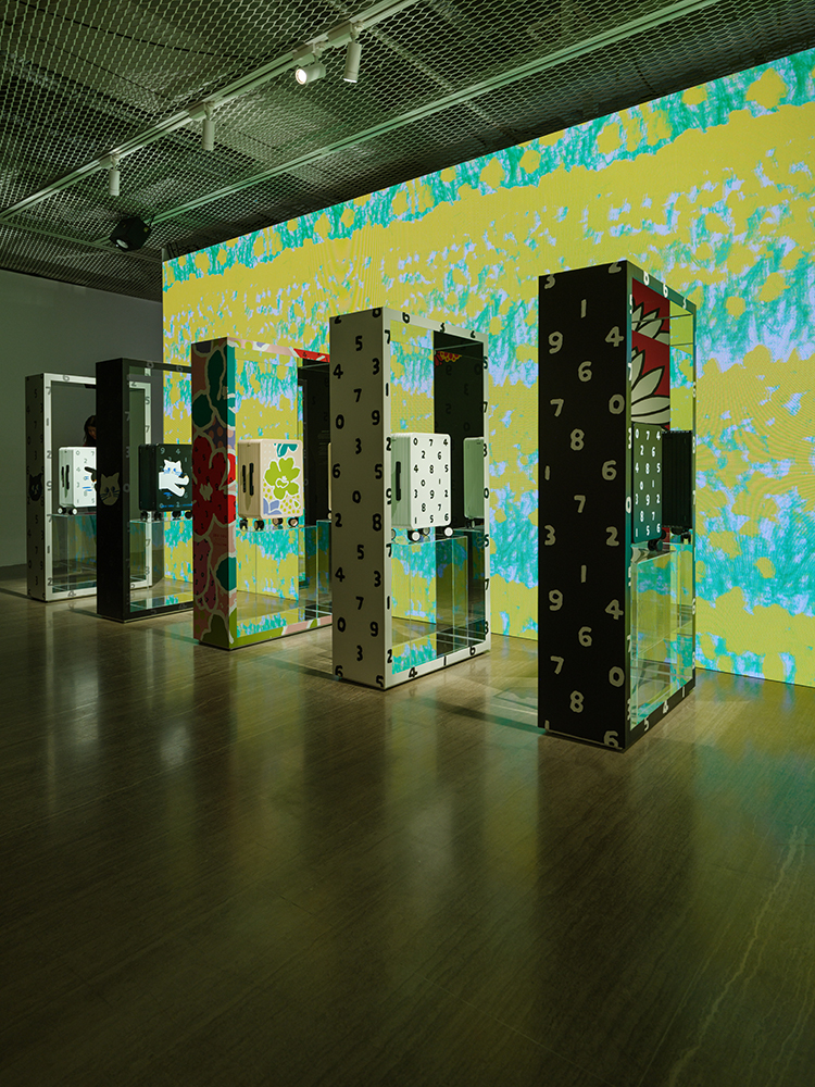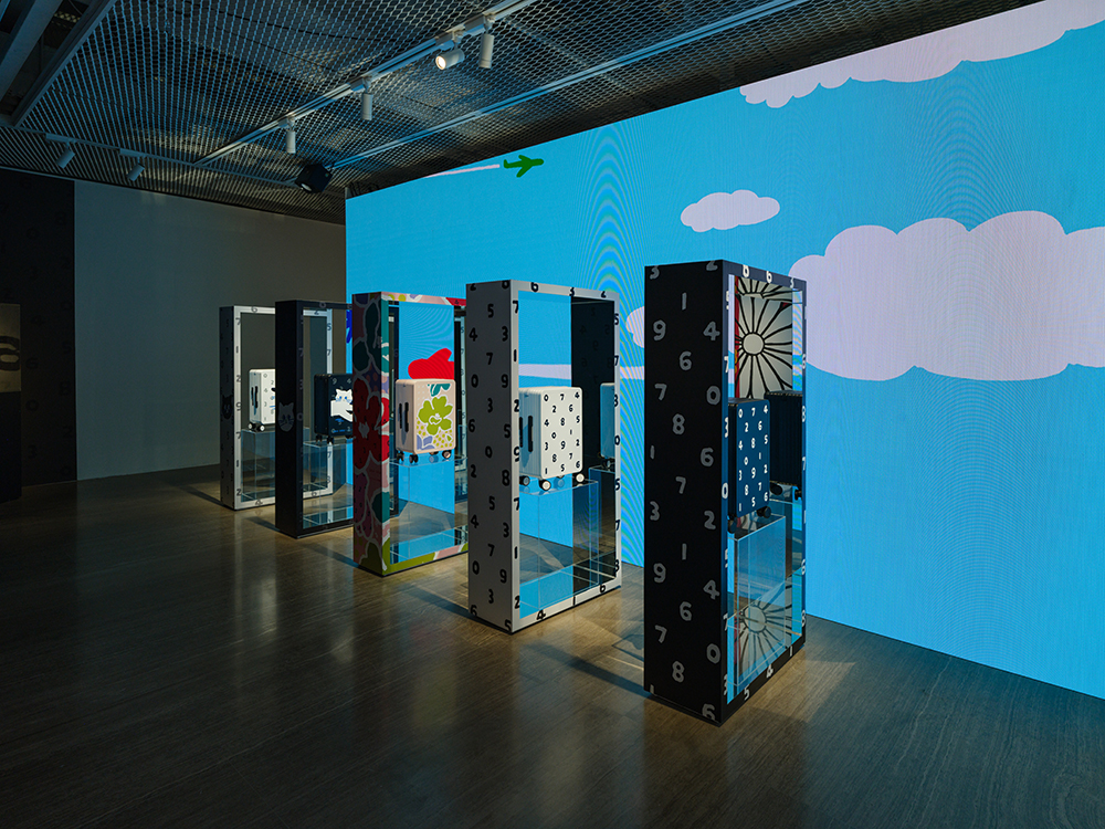 スタイリッシュな什器の背面には、飛行機が飛び交う様子や車窓をイメージしたデジタルアートが流れています。