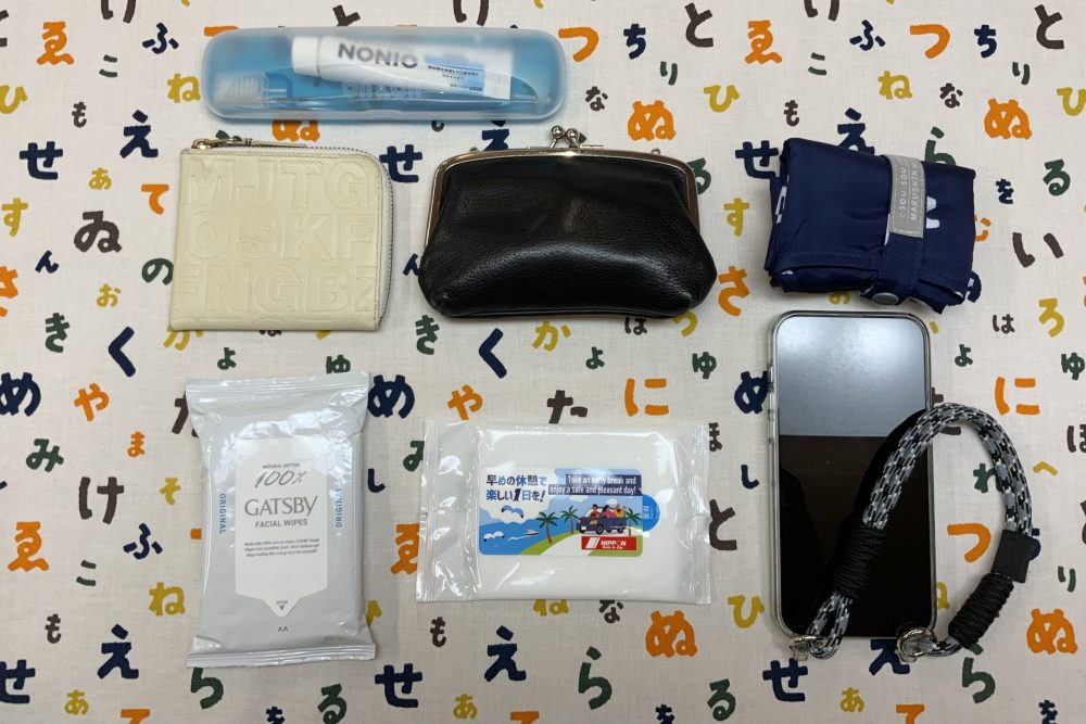 財布 スマートフォン がま口親子 エコバッグ 汗拭きシート ウェットティッシュ 歯ブラシ 結構たくさん入りますし、まだ余裕がございます。