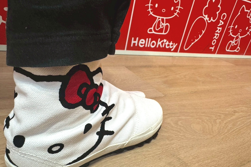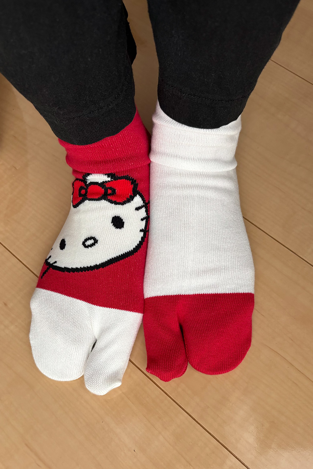 足元は、足袋下と地下足袋のどちらもHello Kittyコラボのアイテムをチョイス。さりげないキティ柄が可愛くて、見るたびにテンションが上がります。