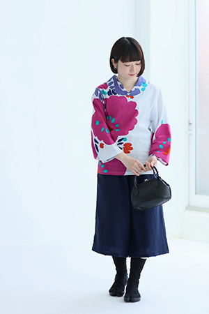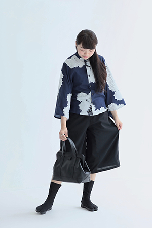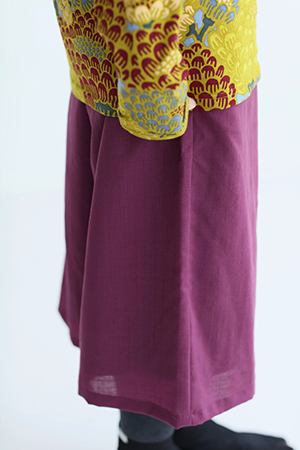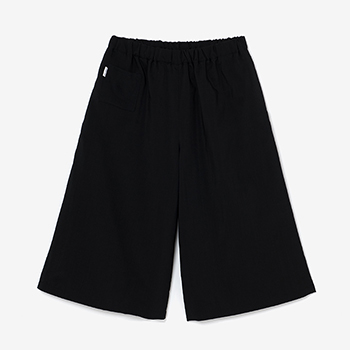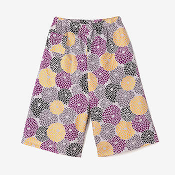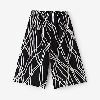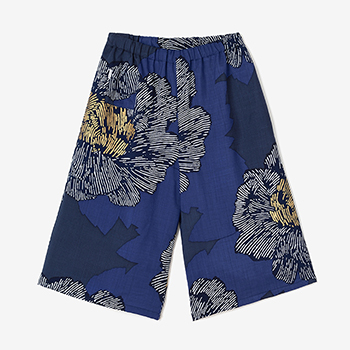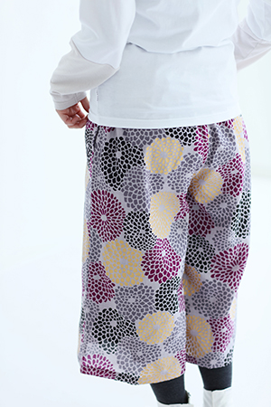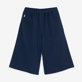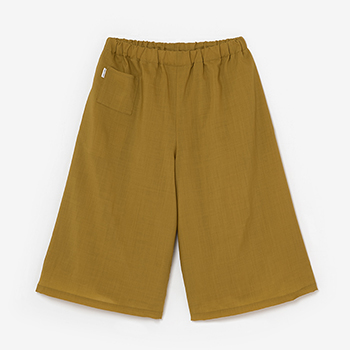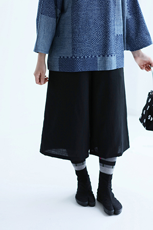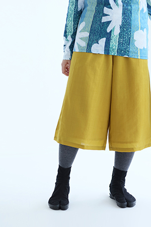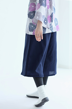 サラリとした肌ざわり、ドレープ感が特長のモスリン生地のパンツ。ふくらはぎまでの「はぎ丈」です。