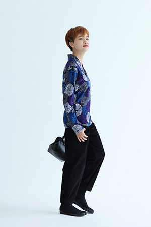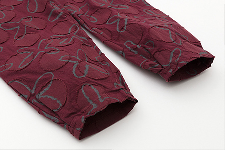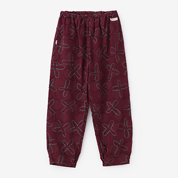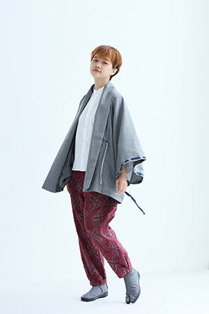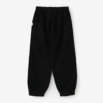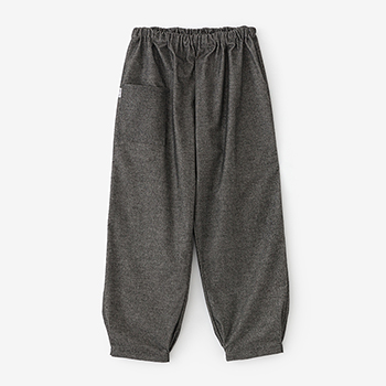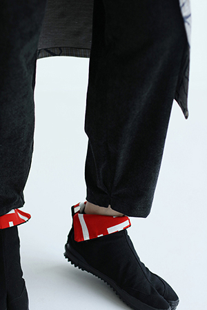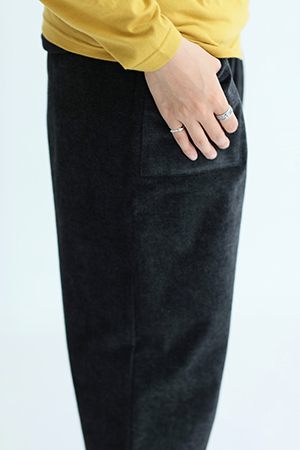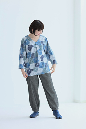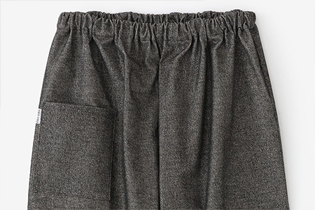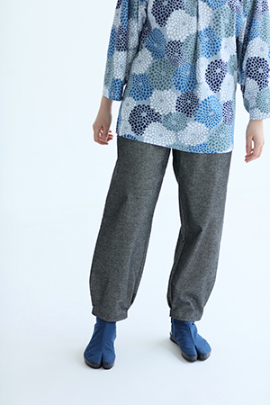 タック(襞)で裾をすぼめたデザインのもんぺです。ウエストは楽で快適なゴム&紐仕様。