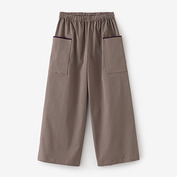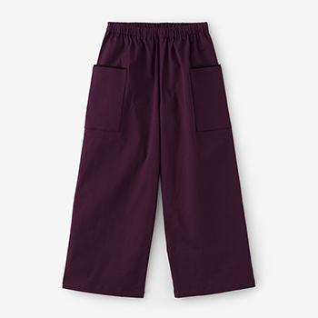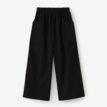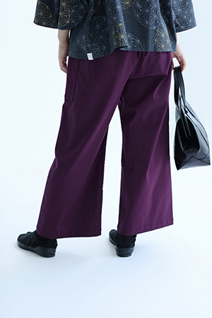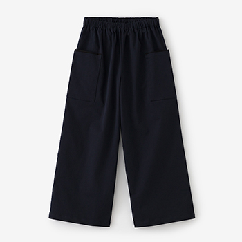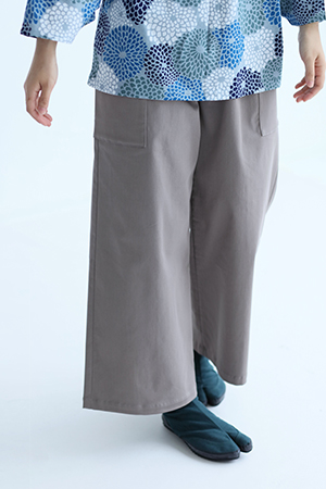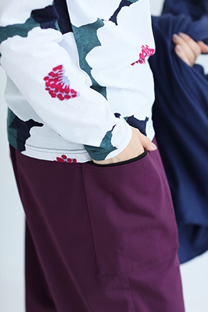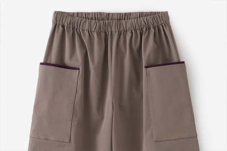 左右に二つずつポケットが付いたもんぺです。イタリア製でストレッチ性のある綿綾織生地を使用。