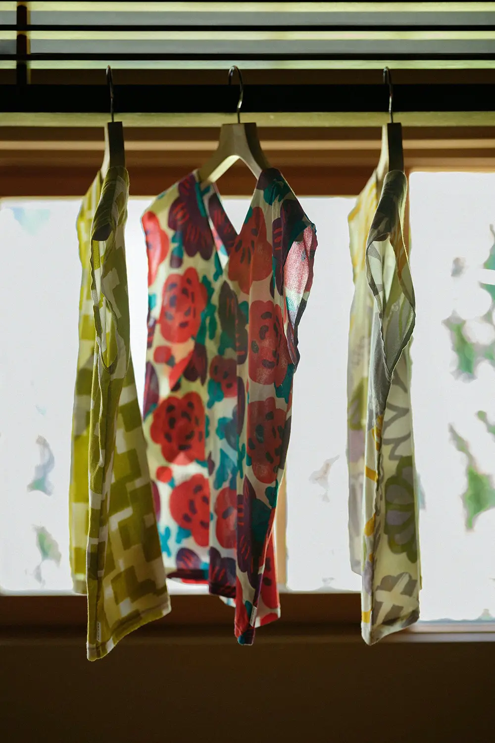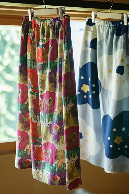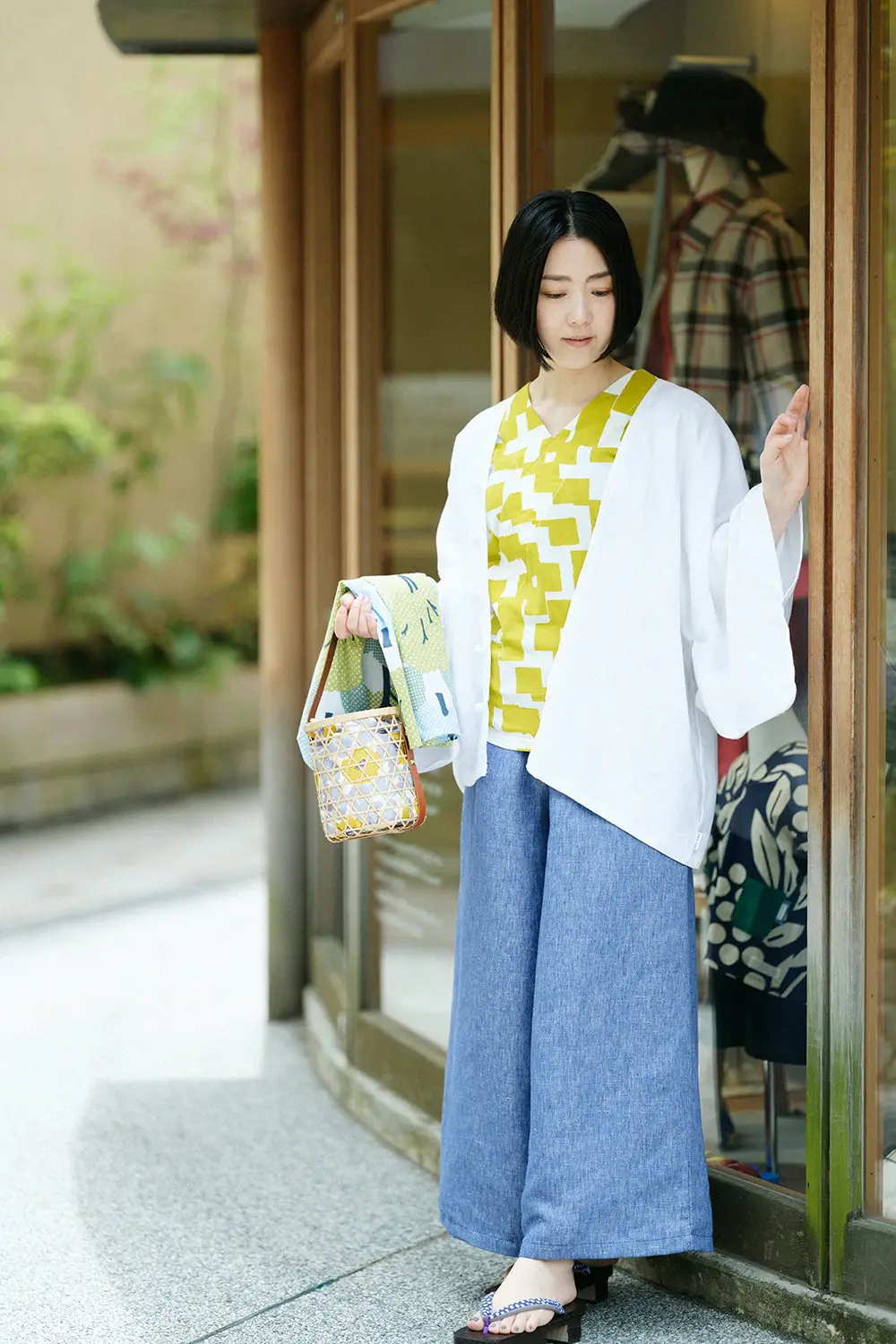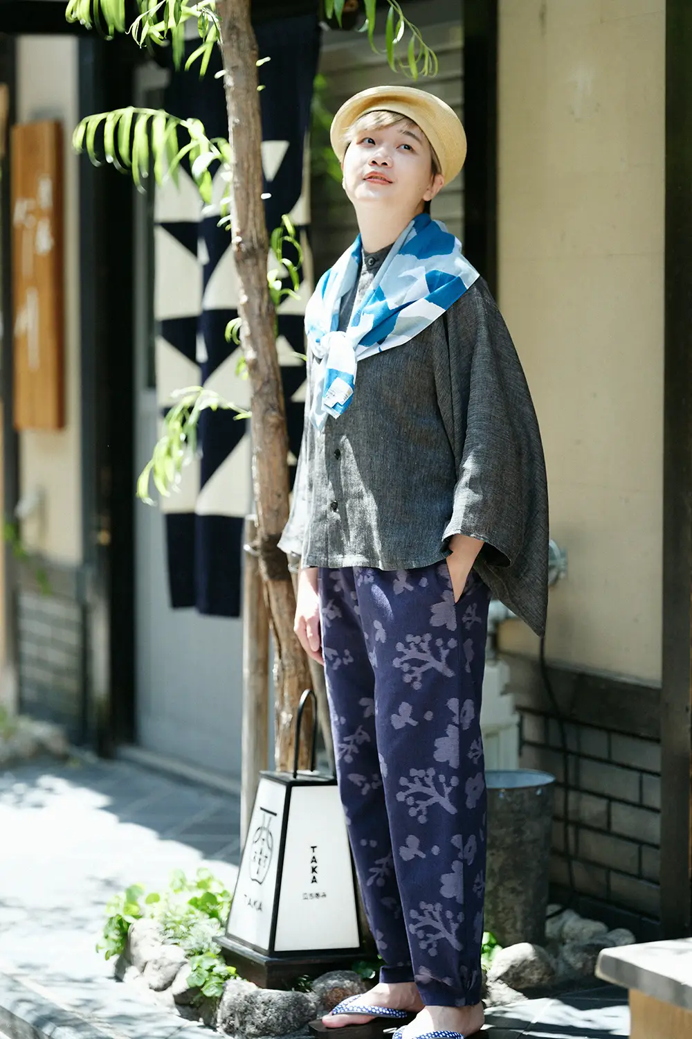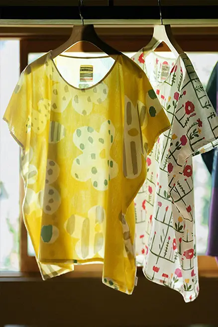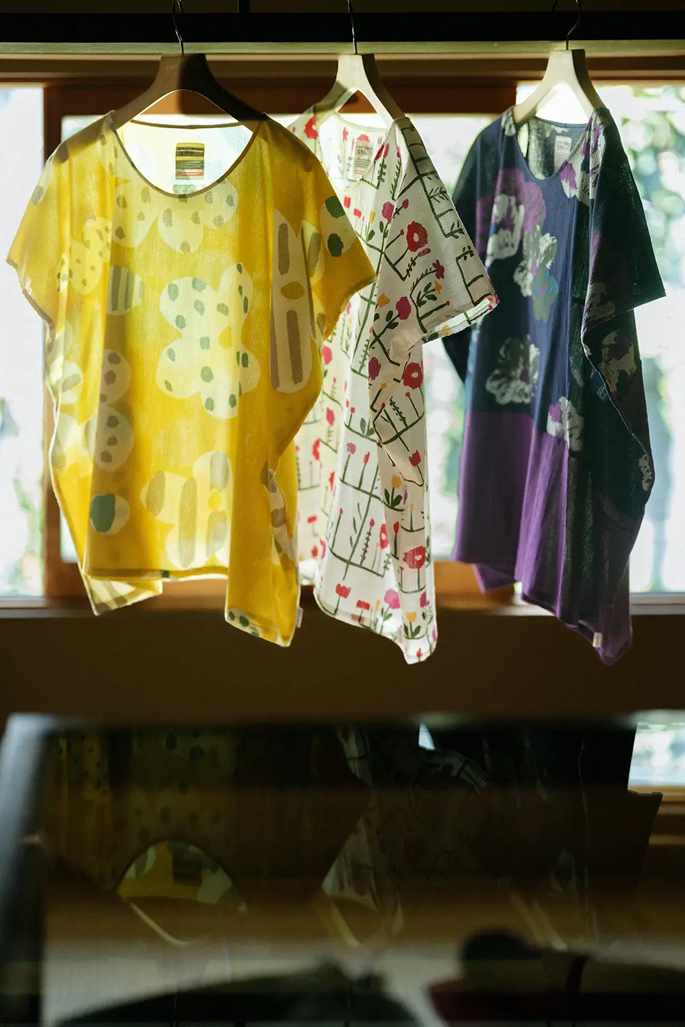 高島縮や知多木綿のトップスは、色とりどり。気持ちよく風を通し、夏の日差しに映えます。