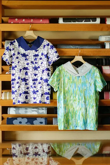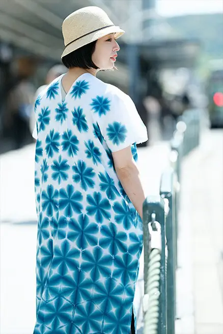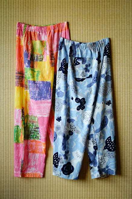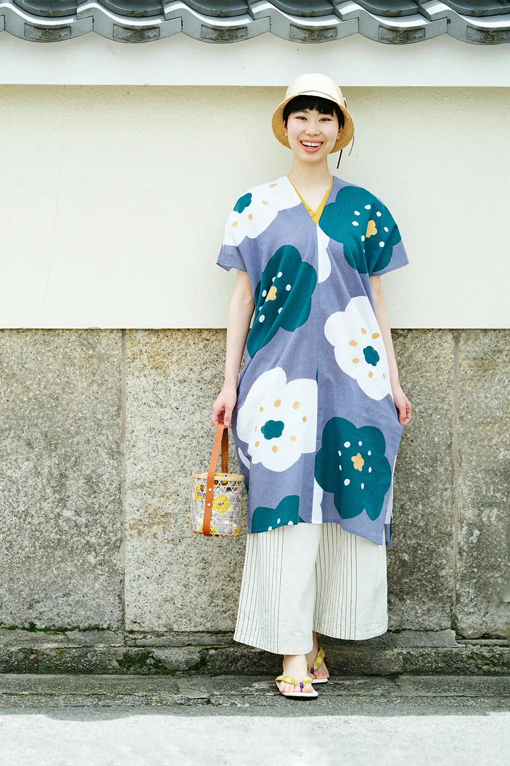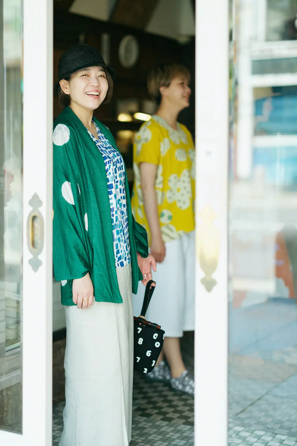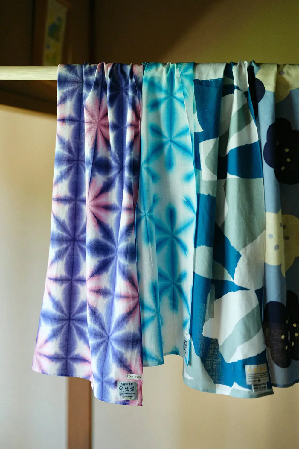 高島縮や知多木綿のトップスは、色とりどり。気持ちよく風を通し、夏の日差しに映えます。