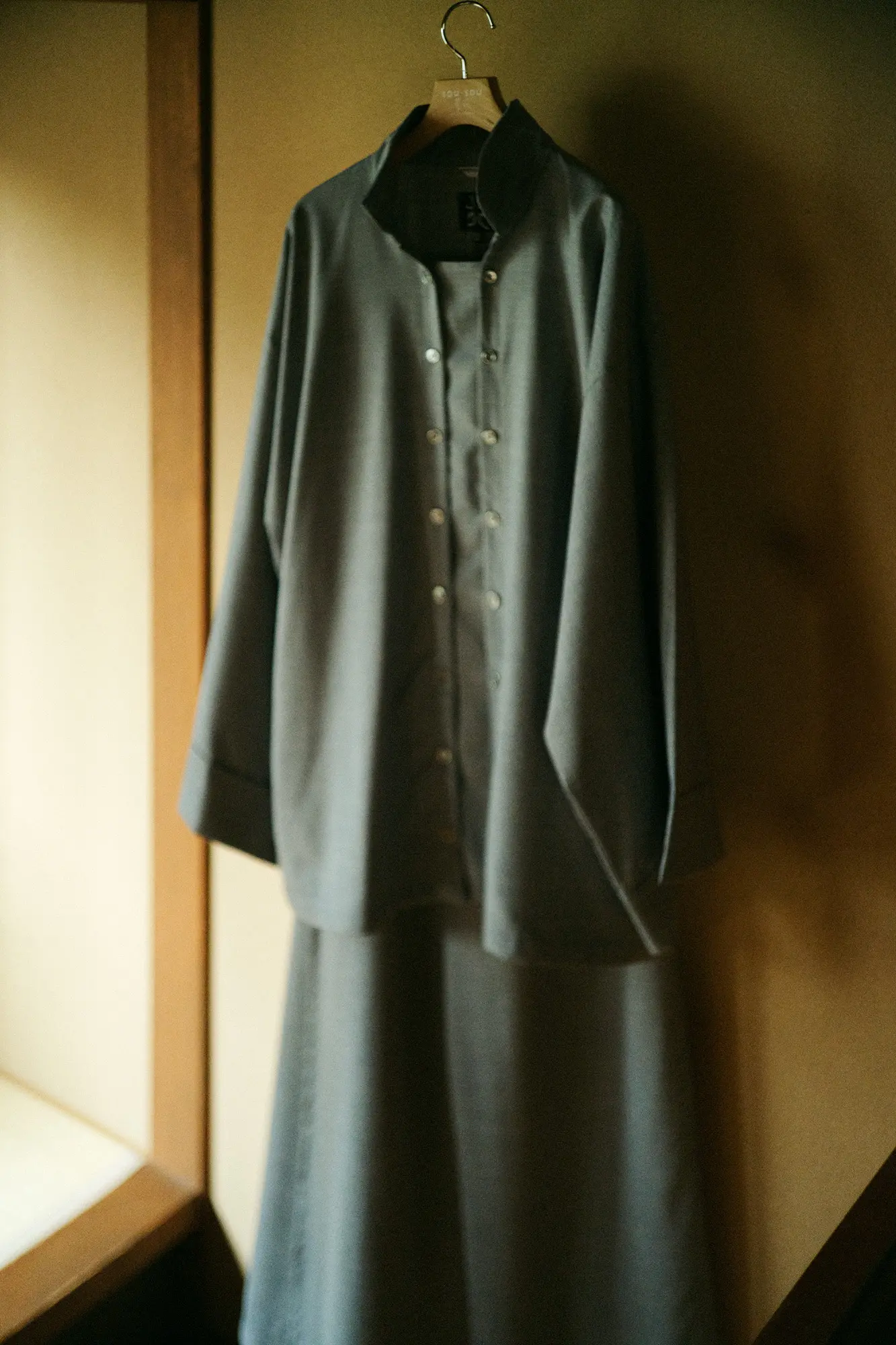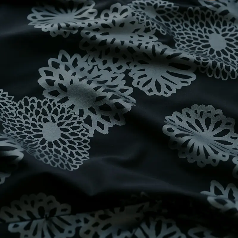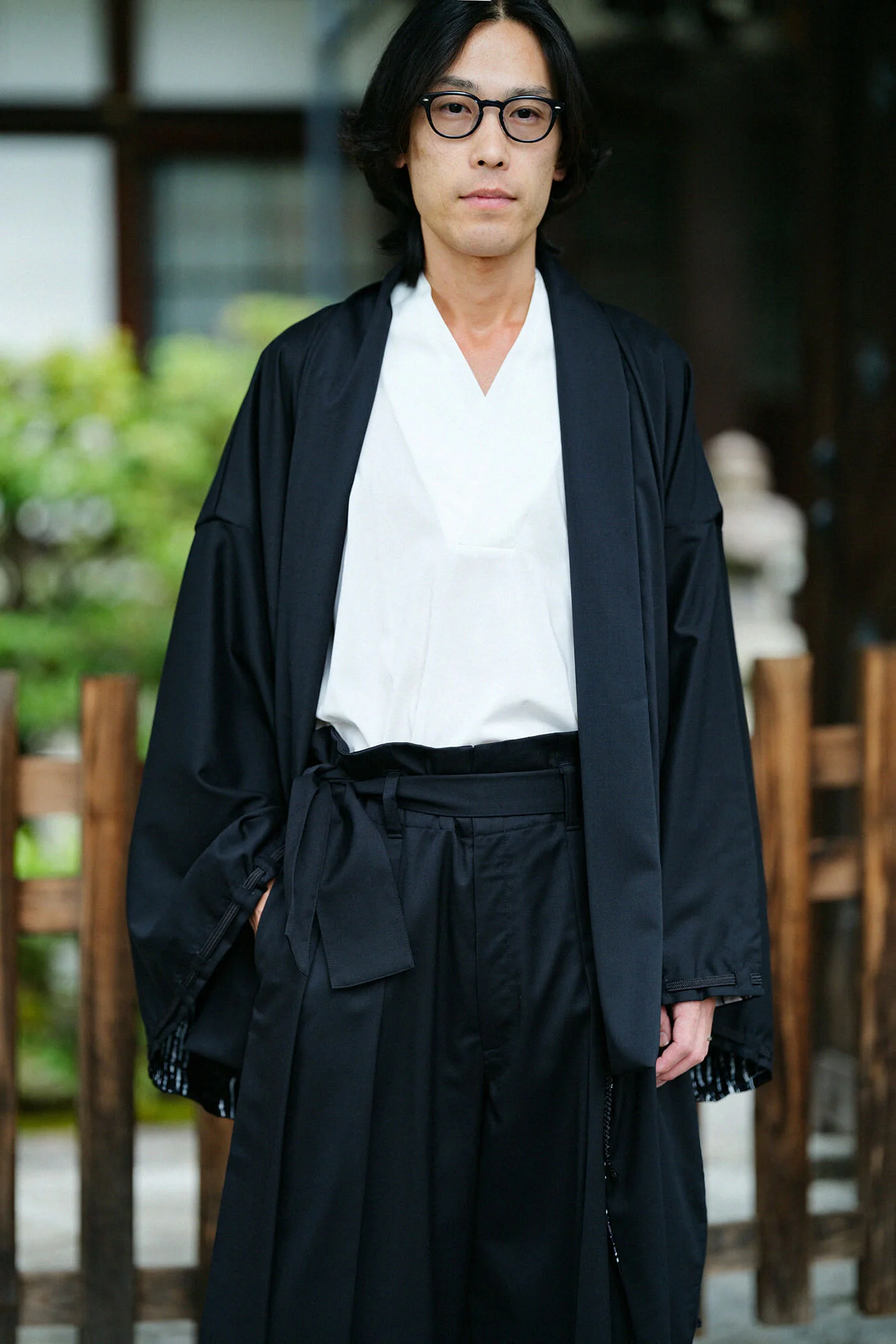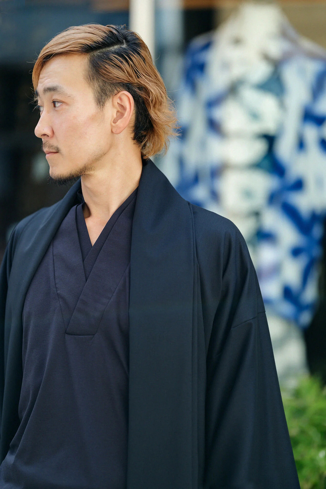 帯電防止を備えた生地に大胆なテキスタイルデザインを京型友禅で施したものや、柔らかさが特徴の希少ウールを使用した羽織や下衣など。行ならではの光沢のある美しさやシルエットを引き出してくれます。