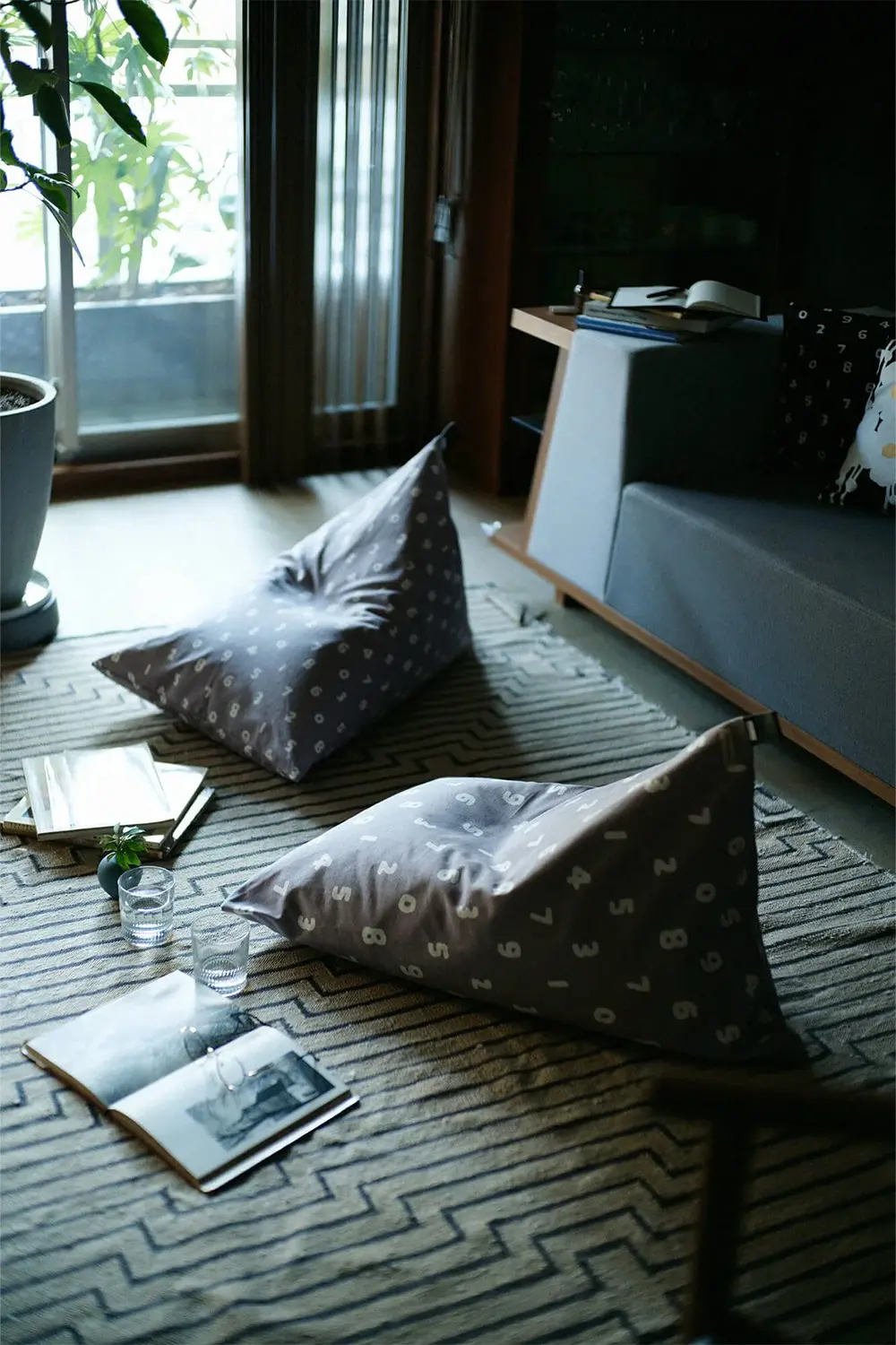 一見普通のビーズクッションに見えますが、座ると背もたれが立ち上がって座椅子の様に。ちょこんと腰を掛けられる「小」サイズと、しっかりともたれられる「大」サイズがあります。※海外発送:不可
