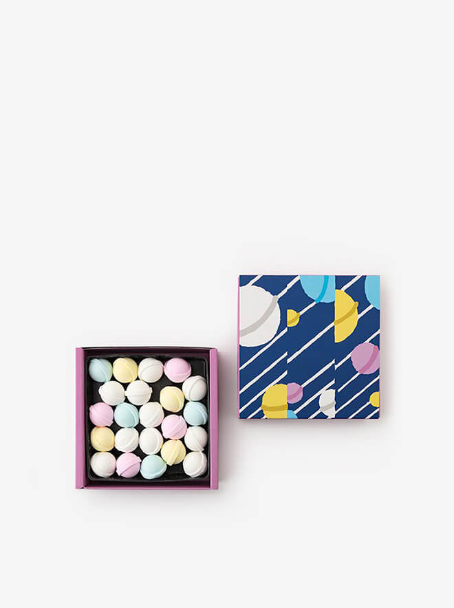 老舗和菓子屋『伊藤軒』とのコラボで生まれたポップなお菓子。やさしい味とかわいい見た目で、贈る人、贈られる人、みんながほっこり笑顔に。