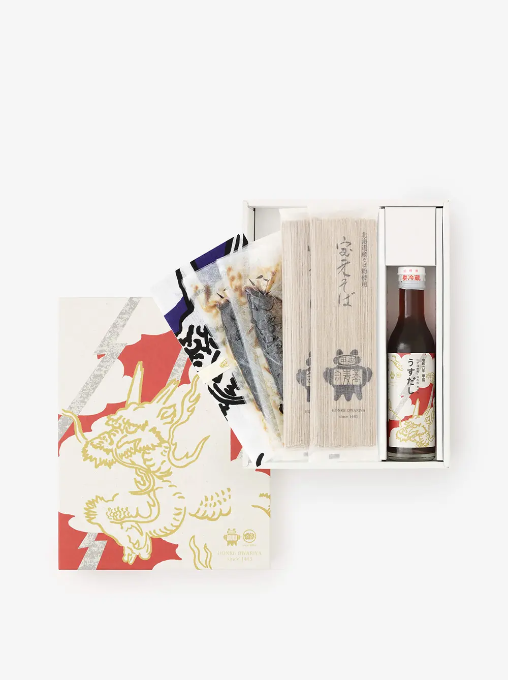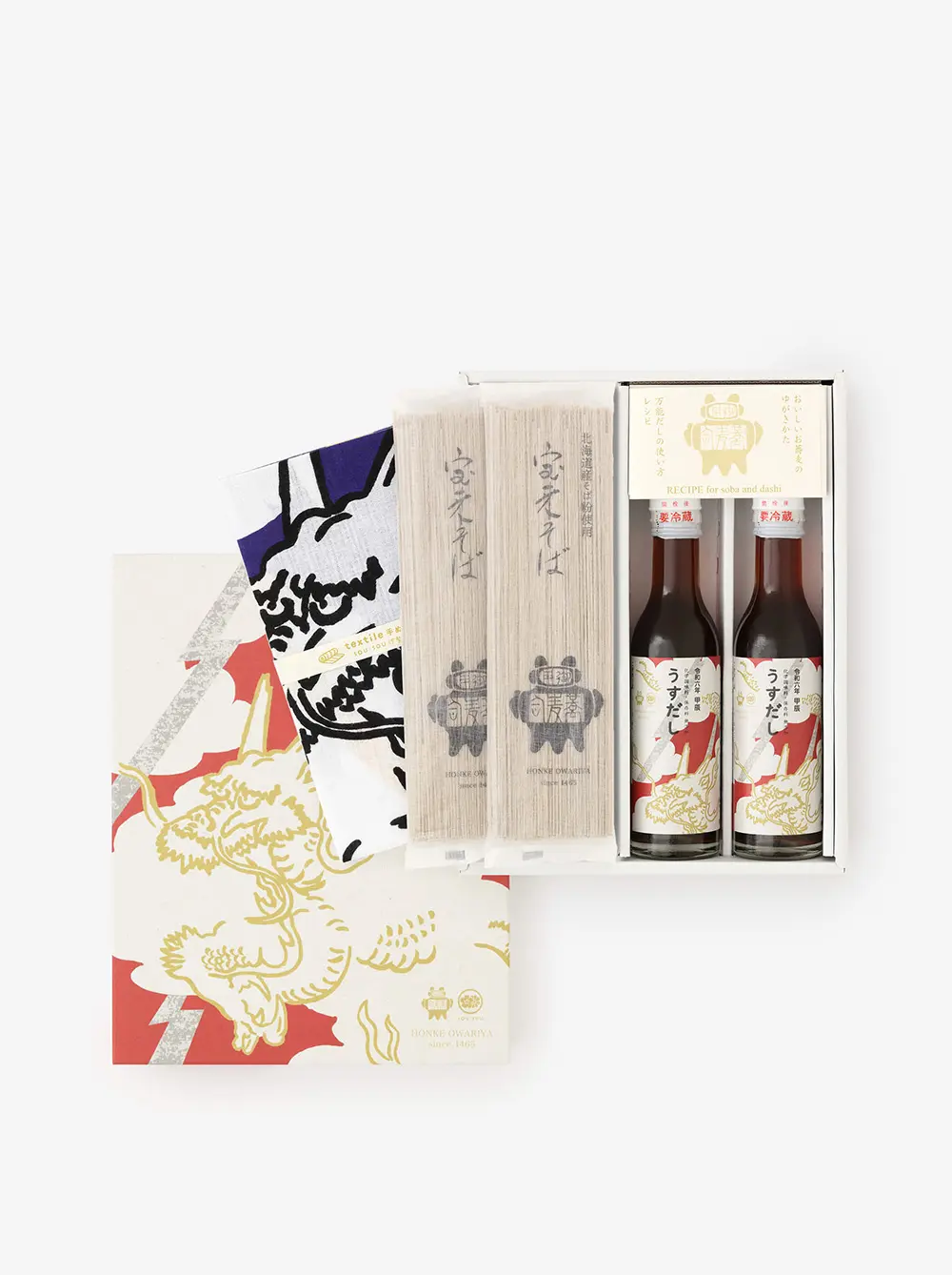 寛正六年創業、京都の老舗蕎麦屋『本家尾張屋』蕎麦の詰合せ。令和六年の干支『辰』が描かれた本企画のためのSOU・SOU限定パッケージでお届けします。贈る相手がふっと笑顔になる、そんな贈り物ができました。