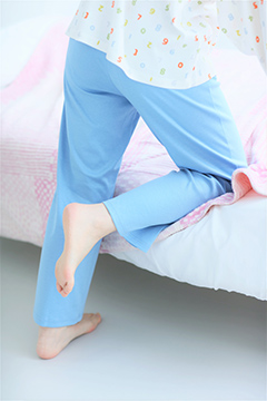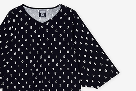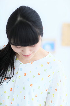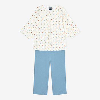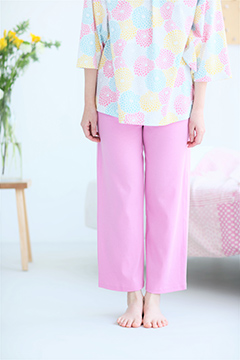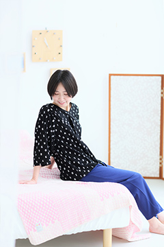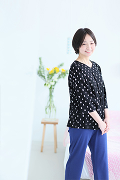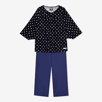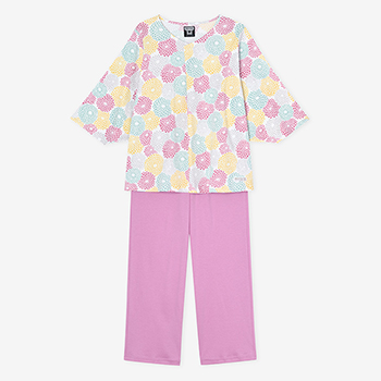 肌ざわりがなめらかな綿天竺のセットアップ。薙刀袖と襟ぐり部分の襞が特徴です。