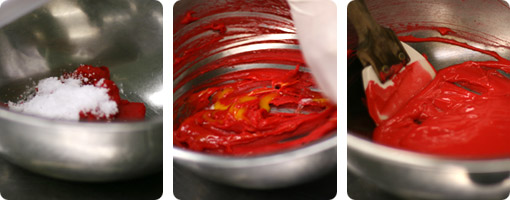 |  砂糖を混ぜ込んだ後、卵黄を加えてさらにしっかり混ぜ合わせます。 | |