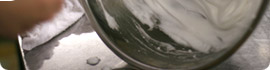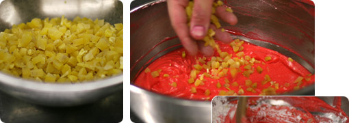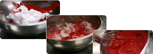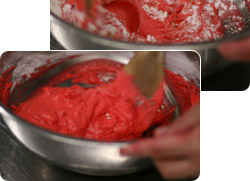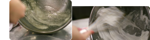 | 半量のメレンゲを入れて混ぜ合わせ、 さらに残り半分を加えて、さっくり合わせます。 |  |