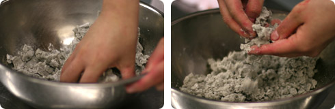 | 生地を裏ごししてそぼろ状にしたものを型に敷き詰めて いきます。 |