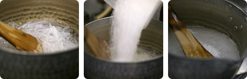 次に寒天にざらめを入れて煮溶かします。(1)