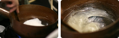 別の鍋で葛と水を混ぜ合わせ、火にかけて透明になるまでかき混ぜます。(2)