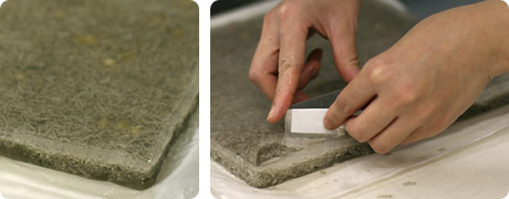 波型になるよう加工した板で軽く表面をプレスして、水面を表現します。