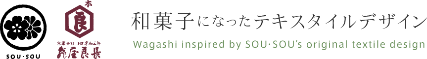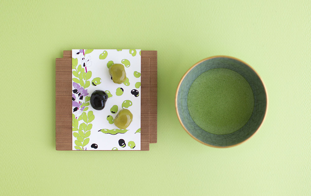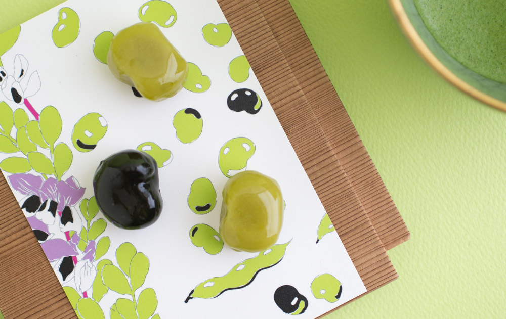 5月のテキスタイルデザインは“空豆”。2種類の味に仕上げました。緑の方は、空豆をペースト状にして白餡を加えたものに、蜜漬けにしたそら豆を刻んだものを入れて食感を加えました。黒い方は、香川の郷土料理「しょうゆ豆」に倣って作ったもの。甘辛い醤油味にピリッと唐辛子を効かせた空豆餡に、刻んだ空豆の蜜漬けが入っています。
