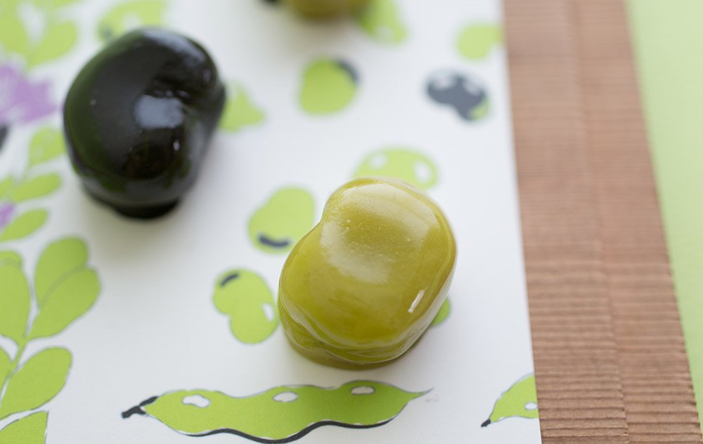 The black one is made in the image of "shoyu-mame" which is local cuisine in Kagawa prefecture. It has sora-mame's paste flavored with salty sweet soy sauce and a bit red peppers, and some chopped honeyed sora-mame are in it. They are shaped to look as real in the same scale, and glazed with kanten(agar-agar).