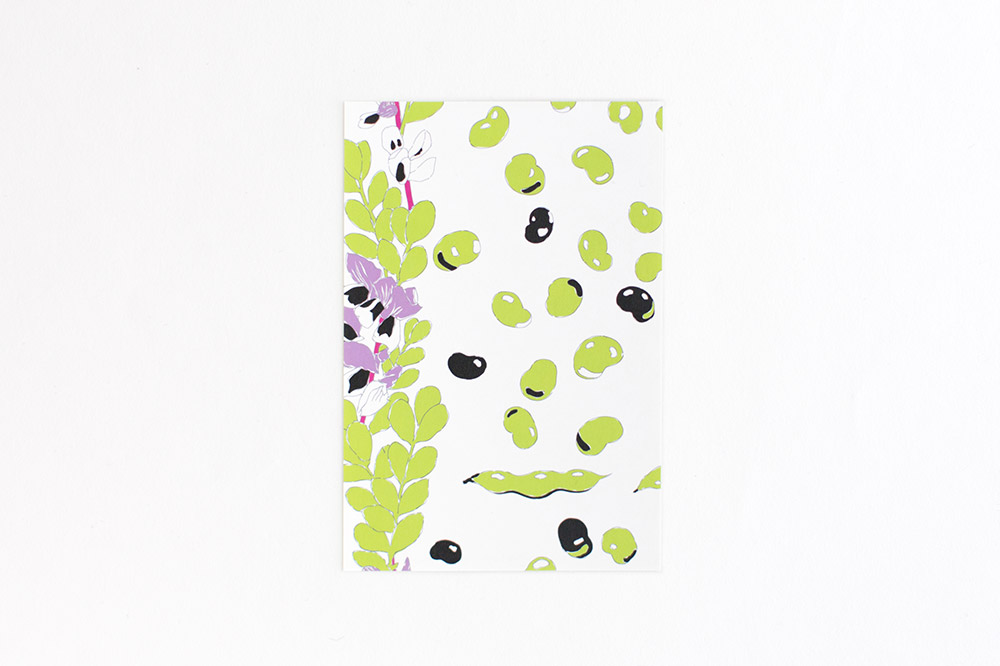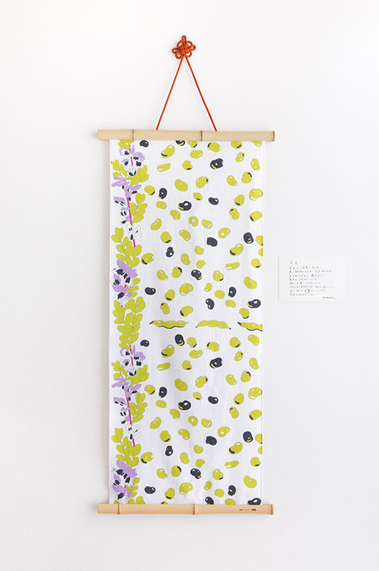 May's textile design is sora-mame (broad beans). We made two different tastes of wagashi. The green one is made of pasty sora-mame and white sweetened bean paste. Some chopped sora-mame which was soaked in honey are mixed to add it the texture.